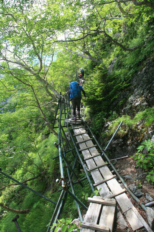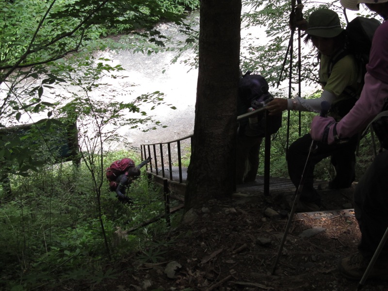 この写真は説明しないとわかりません。なんの異変もないのに、橋の脇を勝手に滑り下りてしまった人がいたのです。下に見えるのは椹島の車道。なんで落ちたのか本人もわからず、無傷で滑り降りたのもけっこう奇跡的でした。みんなで笑ってしまいましたが、特別に運がよくなければ、大きな事故になっていたところです。階段を降りる順番待ちのところで、なんとなくバランスを崩したとのこと。