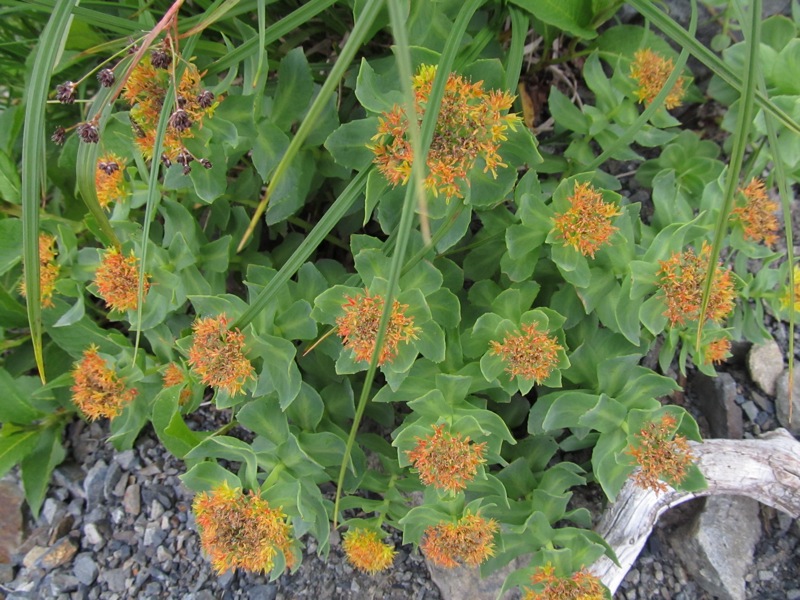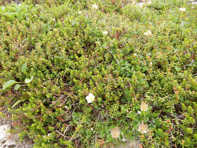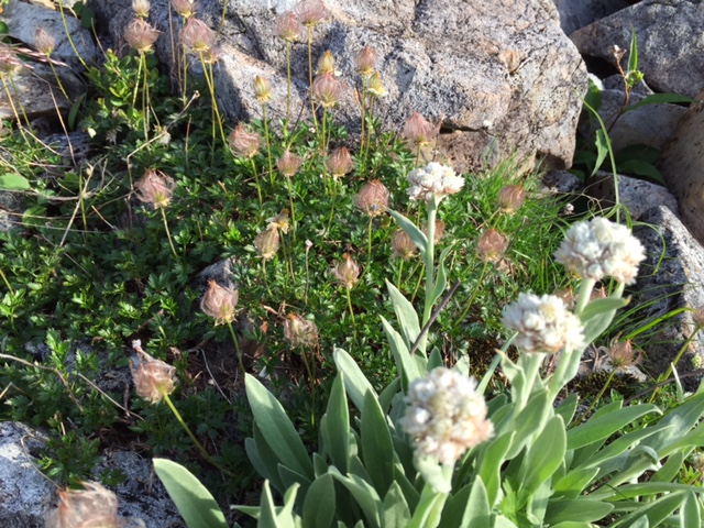 タカネヤハズハハコとチングルマ。朝日を受けて背筋を伸ばしています。