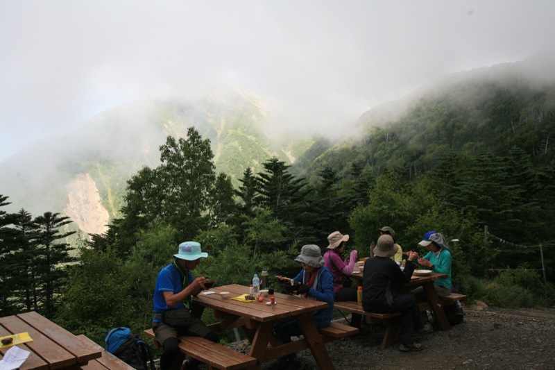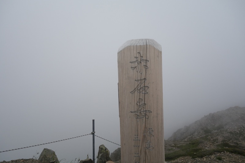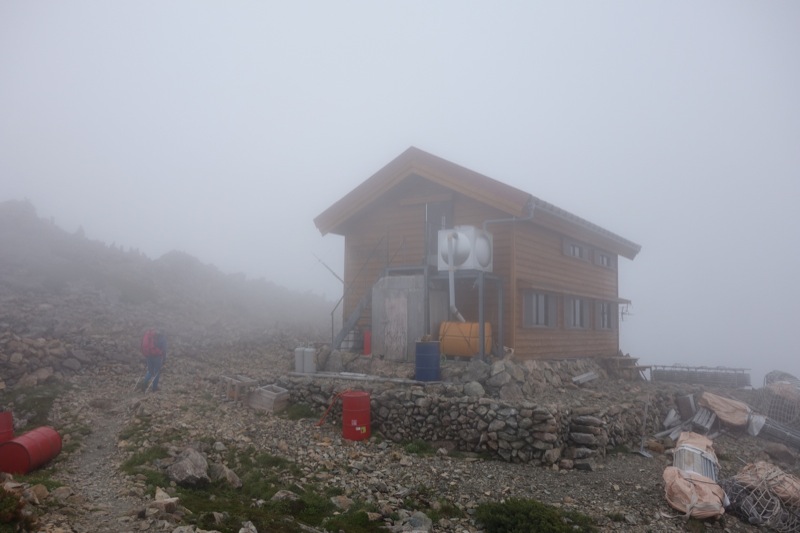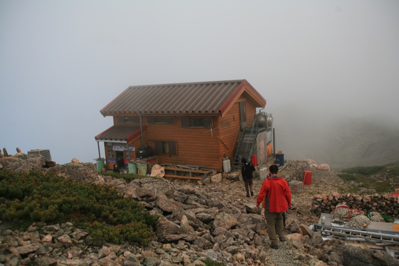 赤石小屋まで下ったら赤石岳はガスに包まれてしまいました。ここで約1時間の休憩。きちんとした食事と食べたかった甘味をゆっくりと味わいました。