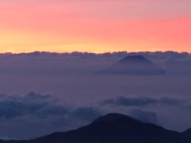 輝く太陽、富士の昨日片鱗。下山の無事を祈りたくなった。