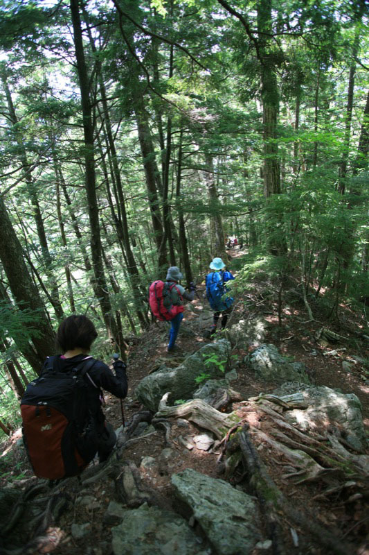 *ただし、大きな心配がありました。天候の問題ではありません。赤石小屋までは完全な樹林帯ですから夏ならどんな天気でも問題ありません。雷雨だって、台風だって。しかし長い下りでのほんの小さなトラブルでも、椹島ロッヂを14時ジャストに出る無料送迎バスに乗れないと事実上帰れないのです。
