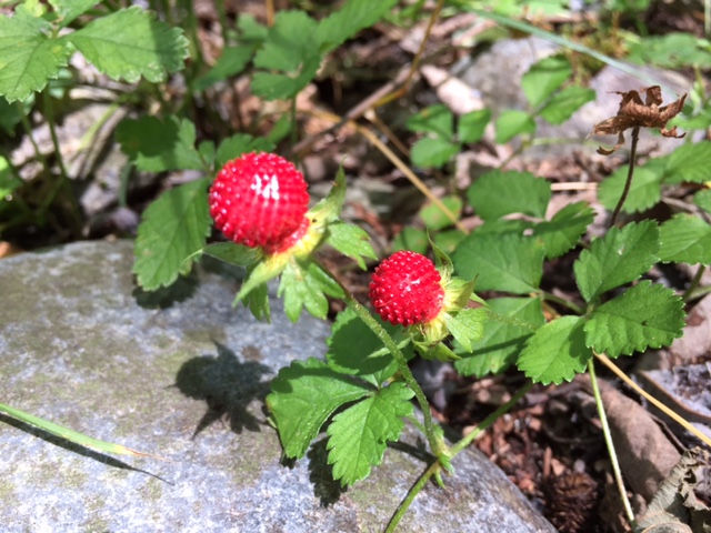 ヘビイチゴ? 無事帰還を祝うかのように照り映える。