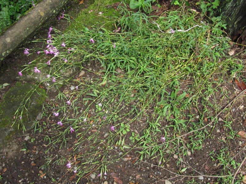 道端のカワラナデシコが風か雨か、あるいは道路を流れた水流で押し倒されていました。