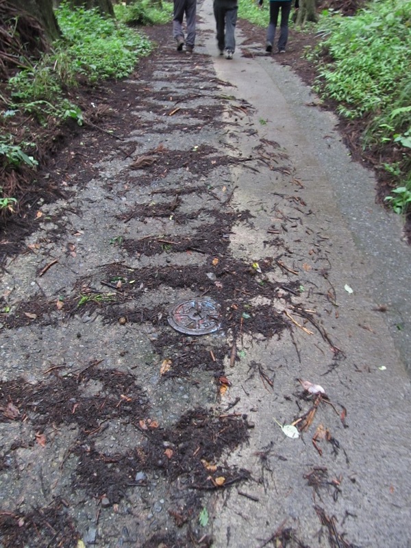 九十九曲りを下ると林道に出ます。昨夜の雨がこれほどひどかったのか、という痕跡がありました。