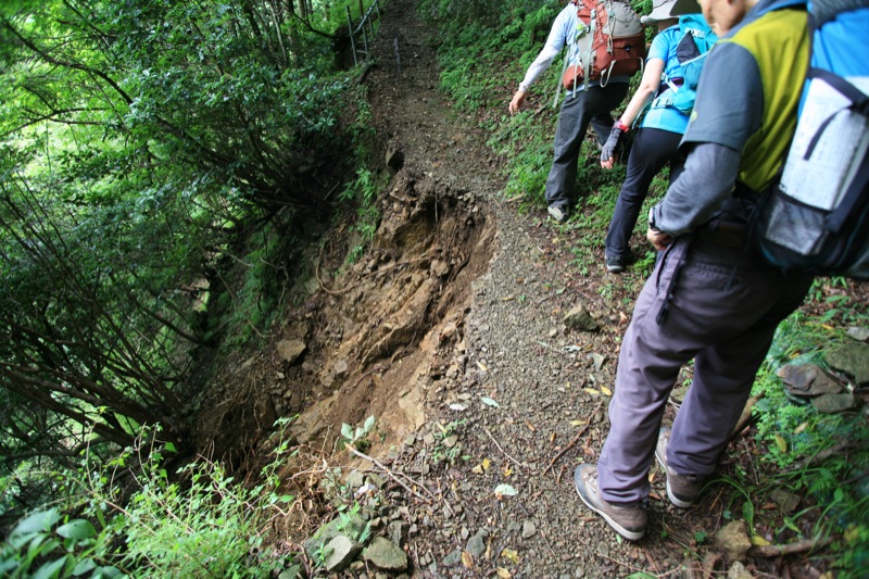 2007年の「丹沢大山総合調査学術報告書」によると「丹沢山地は,南部フォッサマグナ地帯に位置し,北米プレートの下にフィリピン海プレートが沈み込み,さらにそれらの下に太平洋プレートが沈み込むという,世界でも他に無い大変複雑な構造となっている」とのことで、地殻変動も激しく、ここに見るような崩落があちこちにあるほか、道の付替えも頻繁に行われています。私たち登山者は地下深くの激しい変動と、山岳としてはまだ若い地形をこういう場面で覗き見るような気分になります。