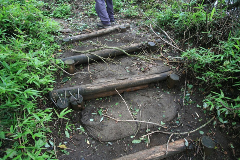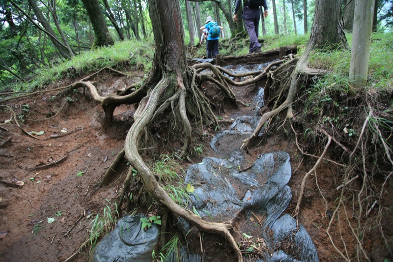 登山道が破壊されると、雨の日には土がどろどろになり、歩きにくいこともあって登山者は道脇の歩きやすいところに新しい道を作ってしまいます。それを防ぐために人知の最後は歩道化です。でもこの風景を見る限り、向かって左側に水を流せば、登山道は濡れることはあっても破壊するほどの暴力を振るうことはなくなるはずです。でもそれじゃあ仕事をした人はお金にならないかもしれない。お金があると世間的に見栄えのいい造作が受け入れられるのは世の常……でしょう。
