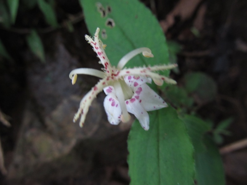 花被片(花びら)が白で紫色の斑点を散らしているという点はホトトギスですが、花被片が強く反り返り、花糸(雄しべ)の下部に紫斑点があるので、ヤマホトトギス。花糸に斑点がなければヤマジノホトトギスだそうですから。でも次に見たときにはまた忘れていると思いますが。