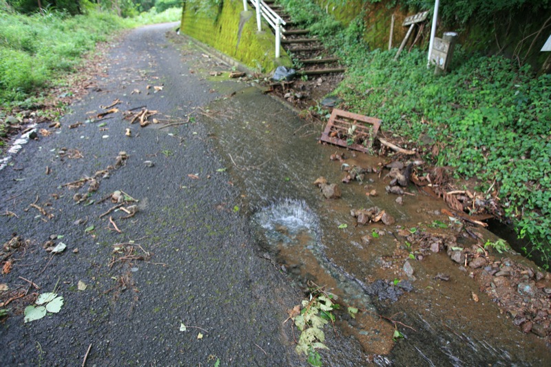 集落が終わって山に入っていく林道がこの状態。昨夜の雨の激しさがわかります。