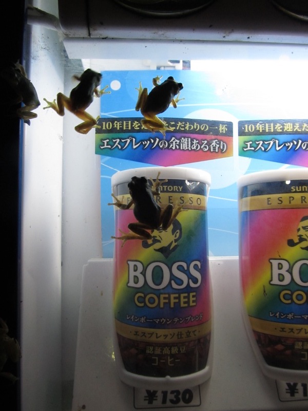 バス停の近くの自販機には、缶コーヒーを飲みたいアマガエルが驚くほどたくさん群がっていました。