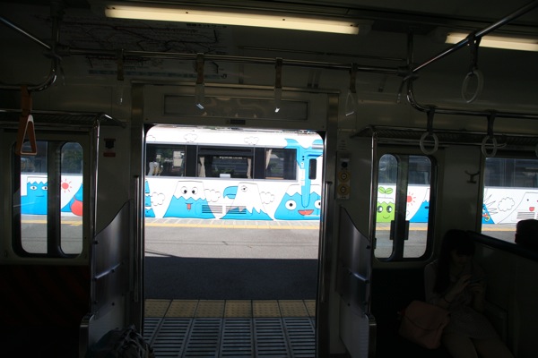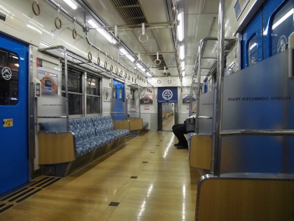 時刻表では9時19分は月江寺(げっこうじ)駅となっていますが、これは9時17分の下吉田駅。鉄道音痴の私にも「ブルートレインみたい」と思わせる車両がありました。とりあえず撮っておいたら、あとでわりと簡単に調べられる。……すごい時代になったものです。