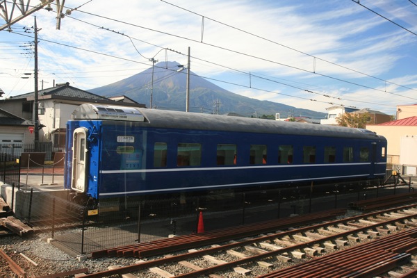 これは「スハネフ14 20」という客車だそうで、寝台特急「富士」のプレートをつけて、土休日には有料で開放されている「下吉田ブルートレインテラス」(おとなもこどもも100円)だそうです。けれど、ネットで見ると、これ自身は「富士」になったことはなく、JR東日本で「さくら」「みずほ」「あさかぜ」「北陸」として運行された車両だそうです。