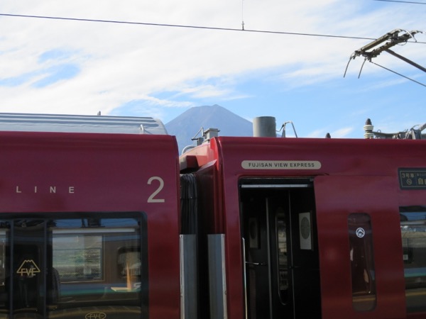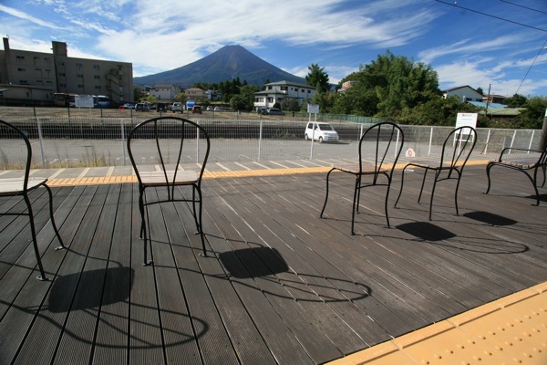 針金細工様の椅子が置かれていたプラットホームは画面右端にちらりと見える板張りのところから先になります。その位置関係は駐車場に止まっている車でわかると思います。つまりこちらはフツーのプラットホーム。富士山はどこからでも見えますが。