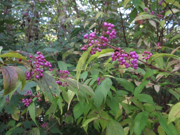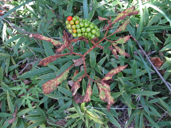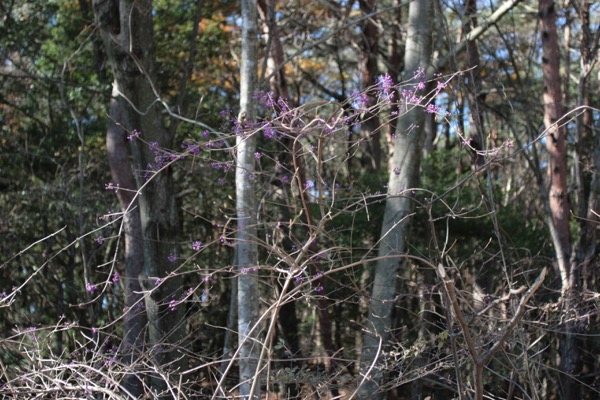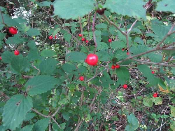 みごとな赤い実がありました。ガマズミの仲間でオトコヨウゾメという木のようです。ガマズミだと赤い実はたくさん固まっていますが、オトコヨウゾメでは枝分かれして数個だそうです。オリジナル写真を拡大してみると、赤い実はもともと2つか3つずつついていたようです。