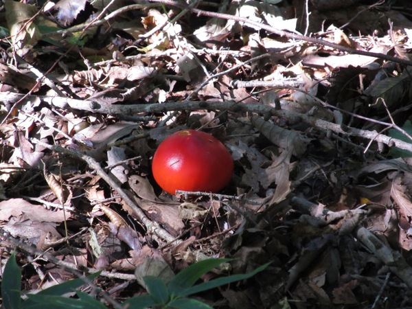 タマゴダケだと思います。最初全体が真っ白な外皮膜に包まれていてまるでゆで卵なのですが、その中からこの真紅の卵が現れてカサを開きます。根本に白い外皮膜が残っていないので、ちょっと違和感を感じましたが。