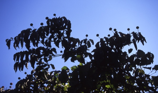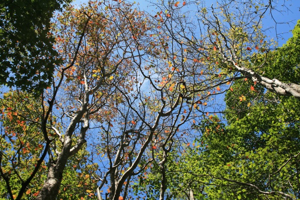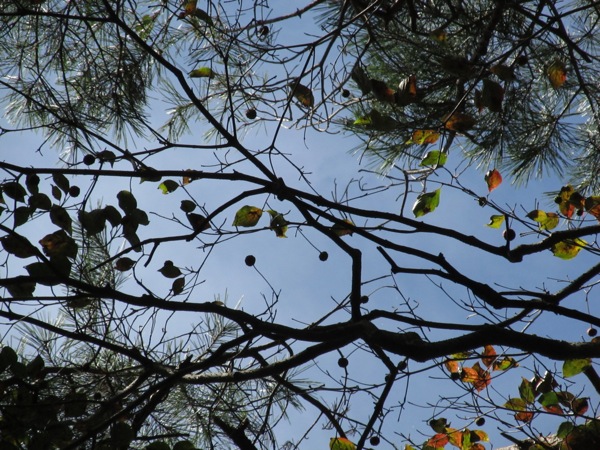見上げると紅葉した木もあるのですが、秋の風情という印象ではありません。