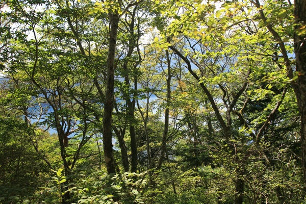 *この日は1200-1305精進ホテル(標高約950m)でランチ→1320パノラマ台下バス停(標高約950m)を出発→1355-1400休憩(標高約1,100m)→1450-1505パノラマ台山頂(標高1,328m)→1535-45烏帽子岳山頂(標高1,257m)→1625本栖隧道(標高約950m)通過。樹林を抜けて→1715本栖湖バス停。