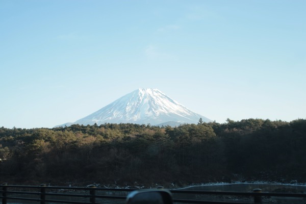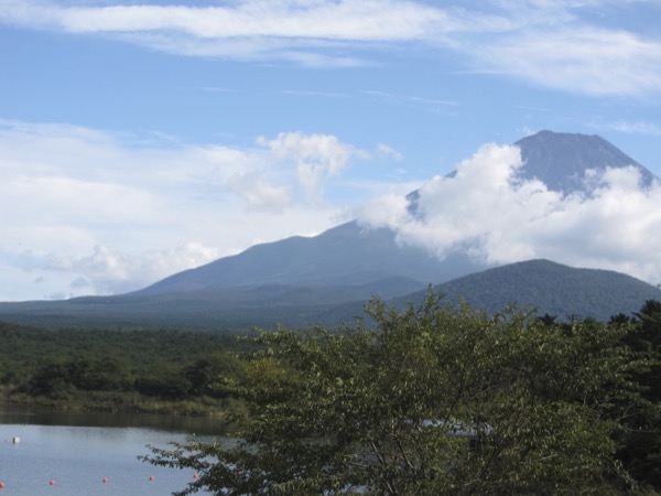 精進湖畔からです。バスの窓から富士山を撮りました。