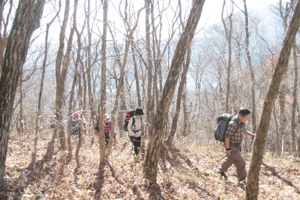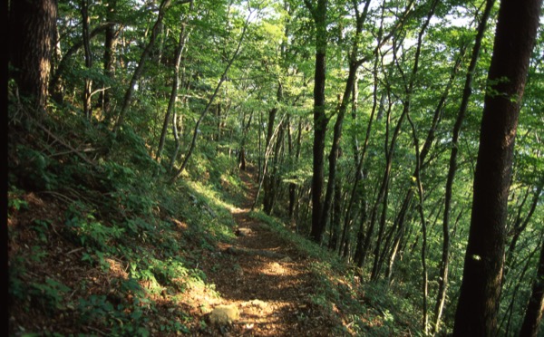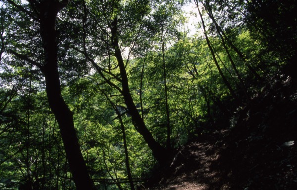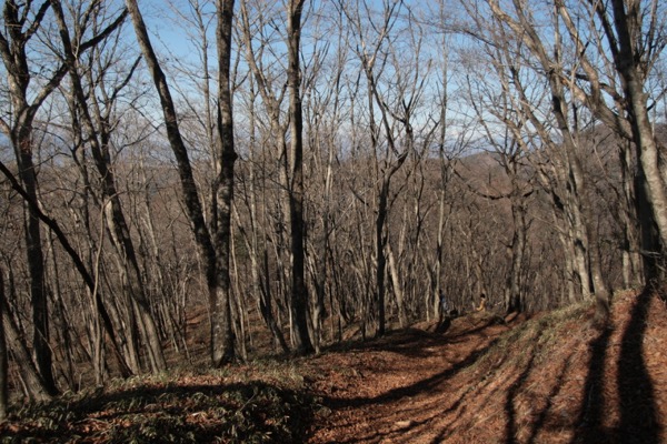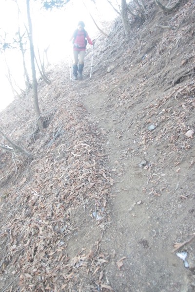 こういう雰囲気、下山が最終段階になるとしばしば体験するのですが、なんというか、手入れをした人の考えどおりに作られたジグザグ道、という印象が強いのです。山裾に住む人達の日常の視野の中にあるからでしょうか、植林地であれ、雑木林であれ、人の手が行き届いている道になったという感じがするのです。あと少し、という気分になります。