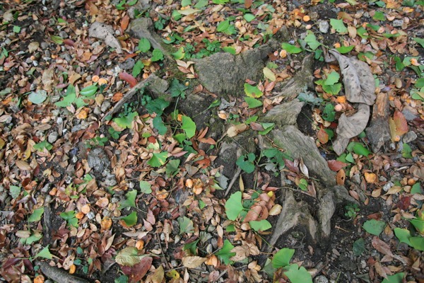 水澤観世音の背後に広がる万葉植物苑ではなぜか緑のままのイチョウの葉がたくさん散っていました。