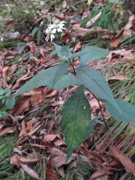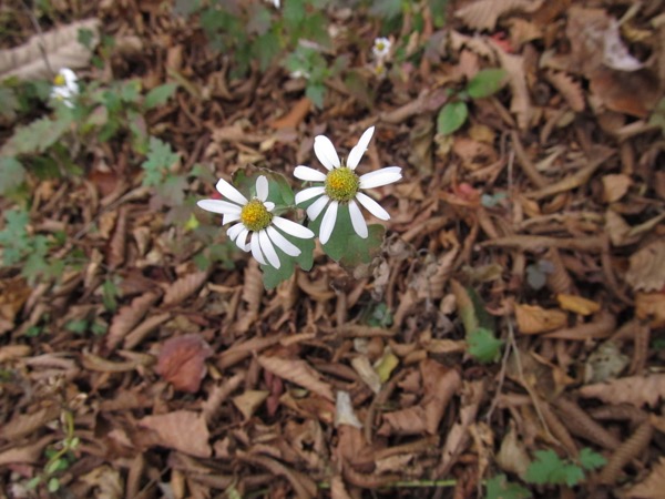 途中で見た野菊の群落をリュウノウギクではないかと考えたのですが、ここで花をよく見ると白い花びら(舌状花)がちょっとスマートすぎるのではないかと思えました。シラヤマギク、シロヨメナ、ノコンギクなどとどこかで識別しないといけないようです。でも、こんな時期にこんなふうに堂々と登場してくる花の狙いはどういうところにあるのでしょうか。