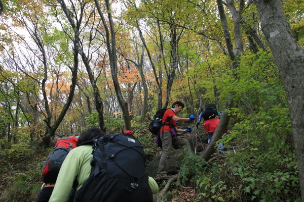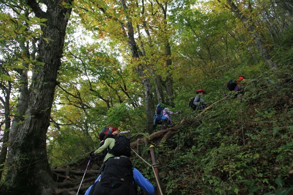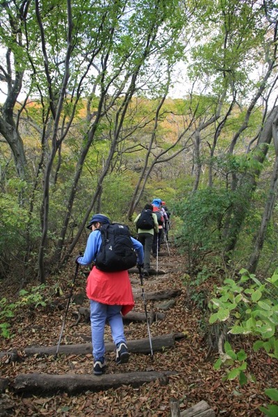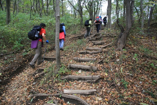 急登は、いよいよ山頂稜線へと近づいているという雰囲気になってきました。平地を時速4H(500m×8)で歩くエネルギー(8パワー)でこの急斜面を登るというのが糸の会が提案する基本的な歩き方。ここは「30度の斜面に20度のジグザグ道」をつけている標準的な登山道(たとえば富士山の県道・吉田口登山道。水平方向に時速1Hで垂直方向に300m登る)の範疇なので、エネルギーの4分の3を体を真上に持ち上げるために使うという意識が必要になります。