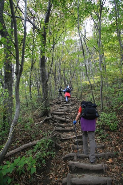 雌岳からの下りはこの階段状土留め。これを登って、下るという道草は約30分でした。