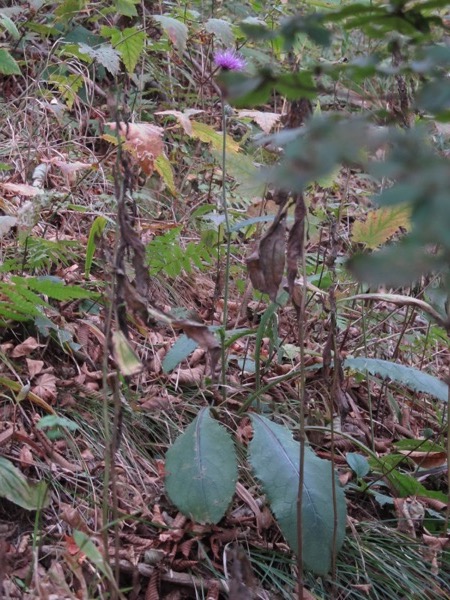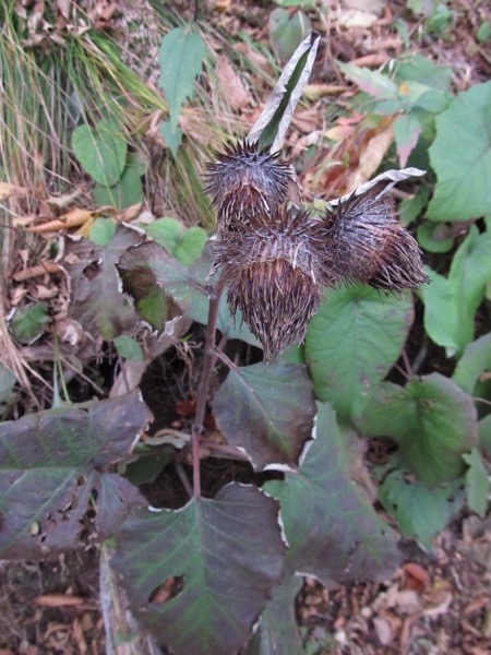 これはオヤマボクチでしょうか。もっと大きく、立派であってほしいなと思いますが。オヤマボクチであればウラジロと呼ばれる葉っぱの裏毛が蕎麦のつなぎに使われたり、火おこしの「ほくち」(火口)となったり、あるいは葉っぱそのものがヨモギの代わりに草餅に使われたりと案外有用なのです。