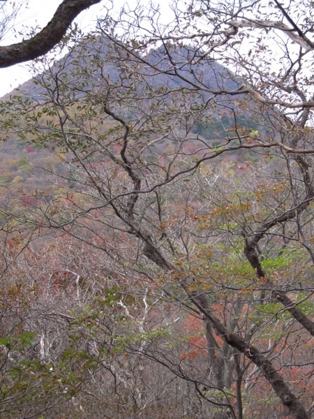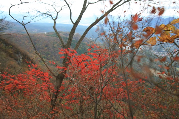 紅葉の向こうに子持山が見えてきました。赤城山は画面右奥に見えていて、そのさらに向こうに連なる山並みは日光連山。