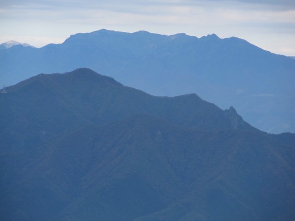 沼田の町からダイレクトに登れる子持山は山腹にある大黒岩(私はヒヒ岩と呼んでいます)がそびえています。見る角度によっては完全にキングコング。その頭の天辺が展望台になっています。一度登ると忘れられない山となります。背後の武尊山(上州・ホタカ)はなかなか厄介な山で、日帰りだと新幹線とタクシーを使った縦走でも時間的にギリギリという大きな山です。その背後に雪のついた山が見えますが、至仏山のように思われます。