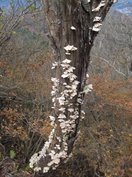 結局このキノコがなんなのか突き止めることはできませんでしたが、トンビマイタケという名を知りました。宮城県の「山菜きのこ直売所・ちいくろ」のホームページには「舞茸、松茸を凌ぐ人気」と書かれていました。別名トビタケというそのキノコはブナの立ち枯れ木に生えて、サルノコシカケと共存することが多いとか。じつはマイタケはミズナラの立ち枯れ木に生えるのだそうで、それと比べると一般の人の目に触れにくい山中のブナの立ち枯れ木をよく見る登山者には見つけやすいキノコといえそうです。アカマツ林でマツタケとの遭遇を夢見るよりは実現可能性が大きいともいえそうです。「舞茸、松茸を凌ぐ人気」という一文がこれから何度も頭の中をぐるぐるとめぐりそうな気配です……が。