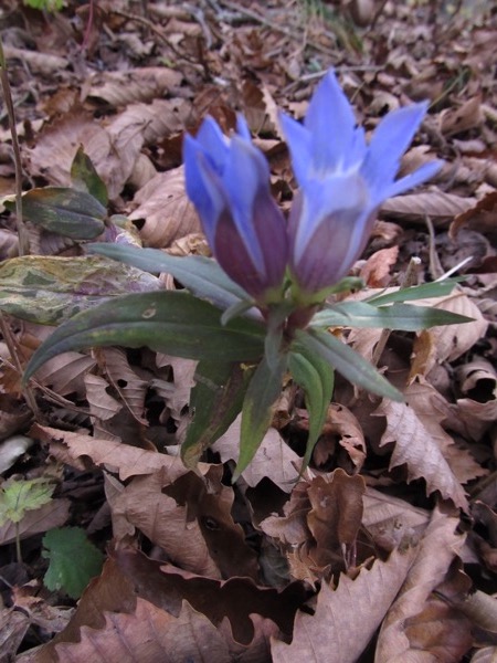 道はリンドウふうになりました。地形図には「森林公園」と書かれています。踏み砕きながら歩いているのはトチノキの枯れ葉だと思います。