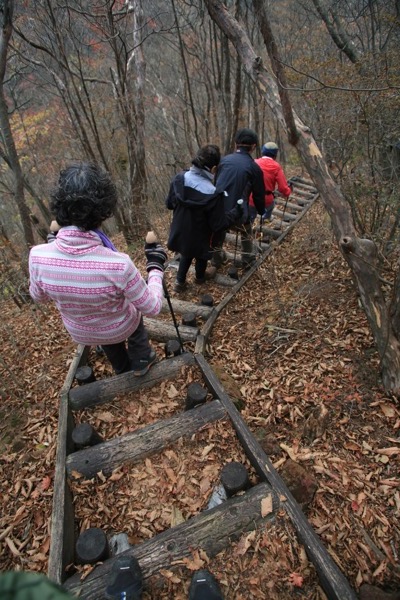 急登部分で振り返って撮りましたが、土留めの木を周囲の林から採っているのでしょうか。自然林といってもかつては薪炭林だったところのようにも思えますから、その場、その場での道の補修が可能なのかもしれません。なにか、そういう自在な技を感じました。渋川市の看板には「この登山道は市が材料を支給し、ボランティアの皆さんによって整備・維持管理を行っております」と書かれていました。