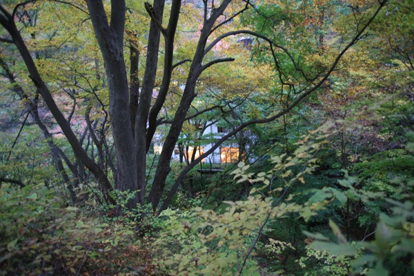 暗くなりきらないうちに、宿の窓明かりが川向うに見えてきました。