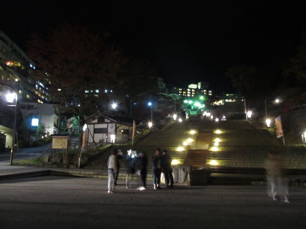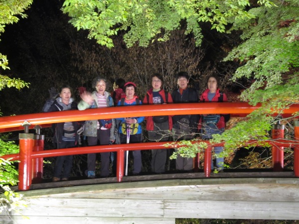 伊香保温泉の湯元に当たる「伊香保露天風呂」に入って、出たところで記念写真。夜の紅葉見物で有名な朱塗りの太鼓橋「湯本河鹿橋」です。残念ながら紅葉ではないけれど。