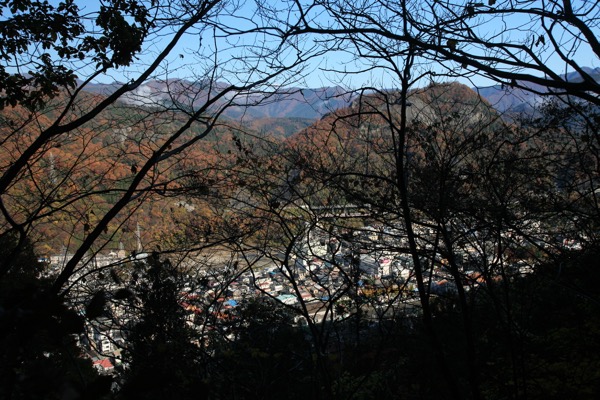 下り始めるとほとんどが植林地ですが、天狗岩という展望台がありました。これは桂川の上流方面。奥にテレビアンテナ塔が立っている三ッ峠山が見えています。富士山は画面左に隠れています。
