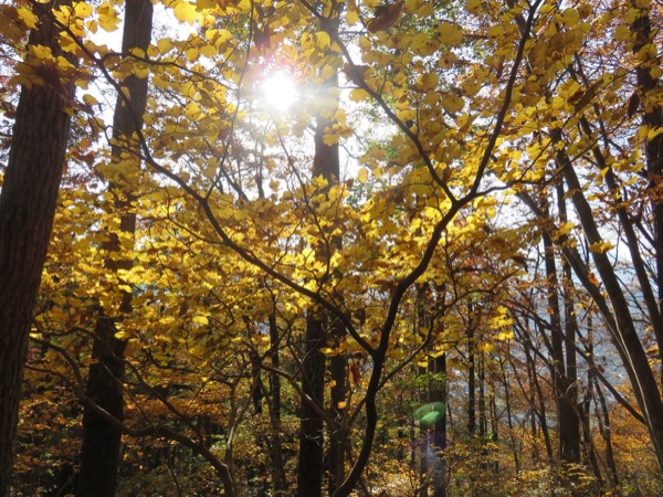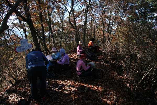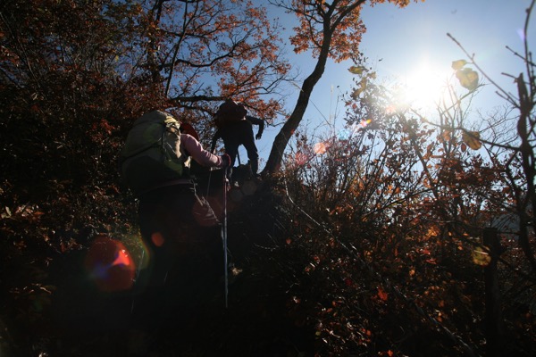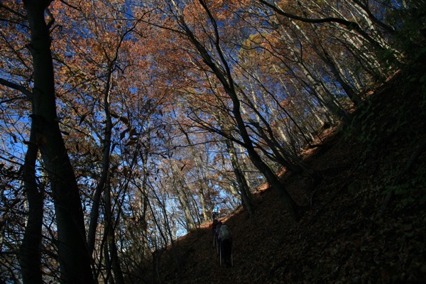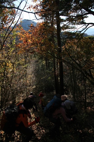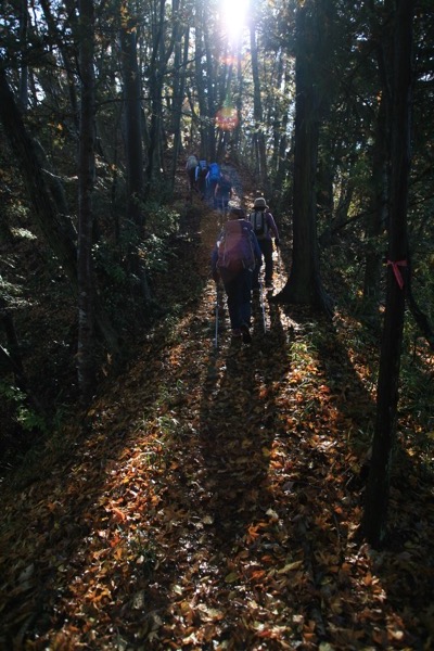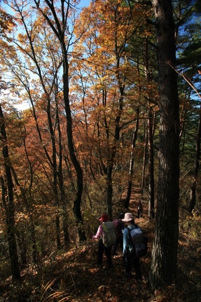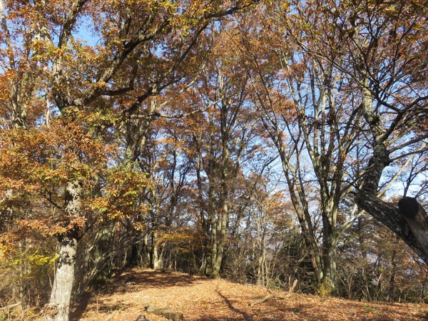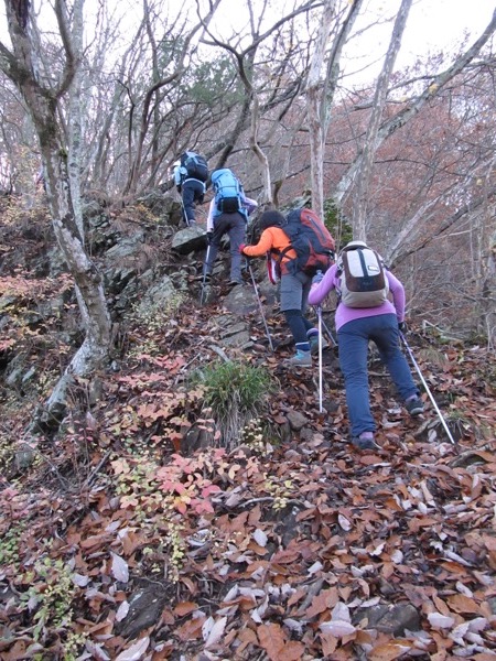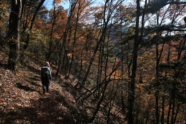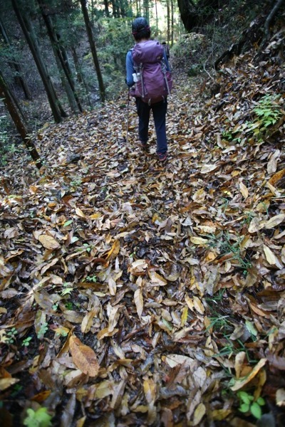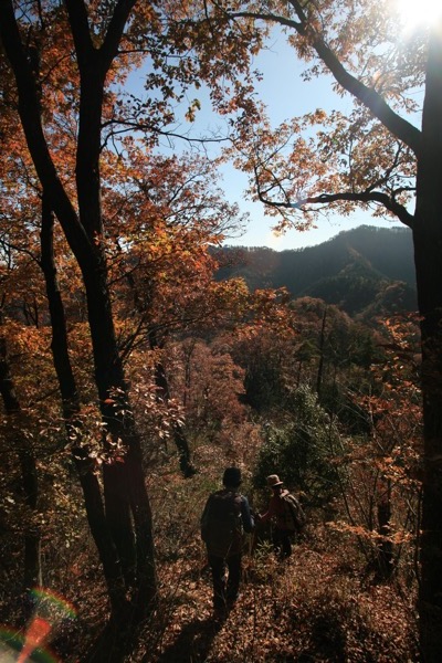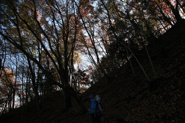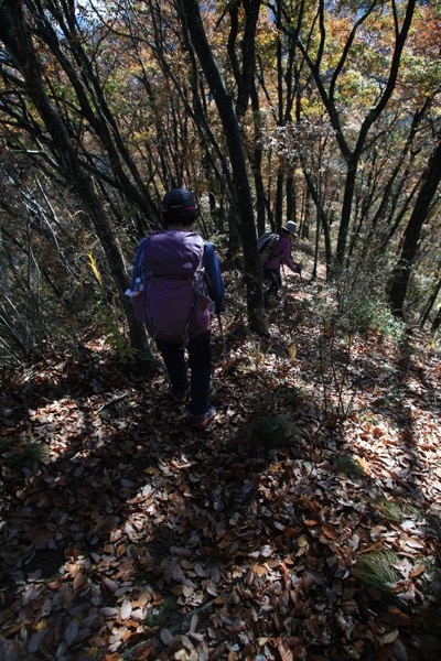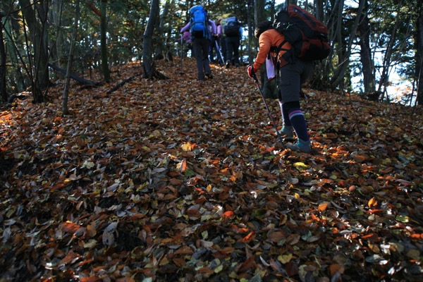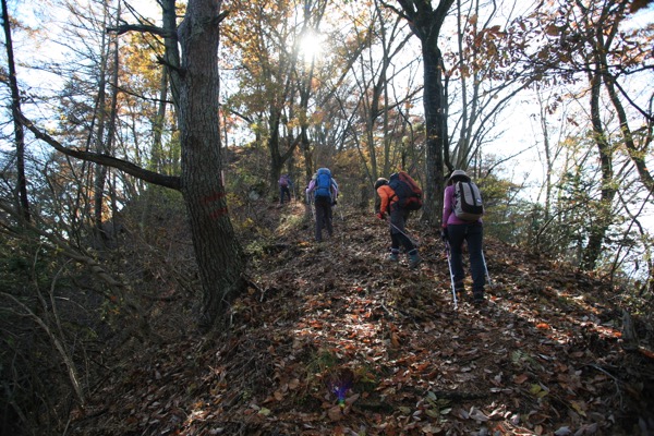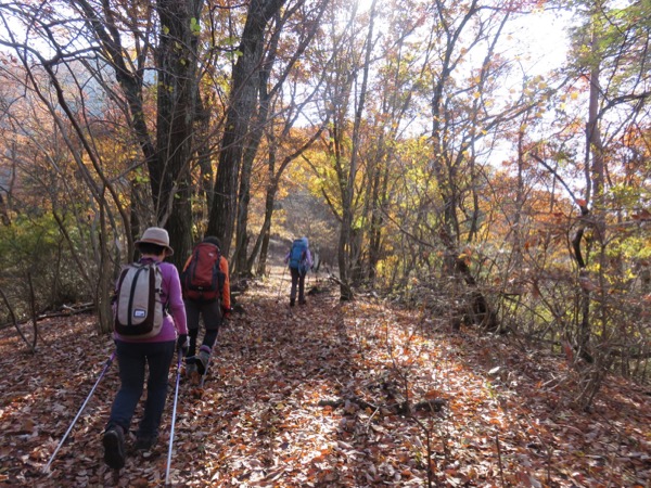 低い晩秋の陽射し。カサカサと落ち葉を踏み 気持ち良い尾根歩きが続いていく。