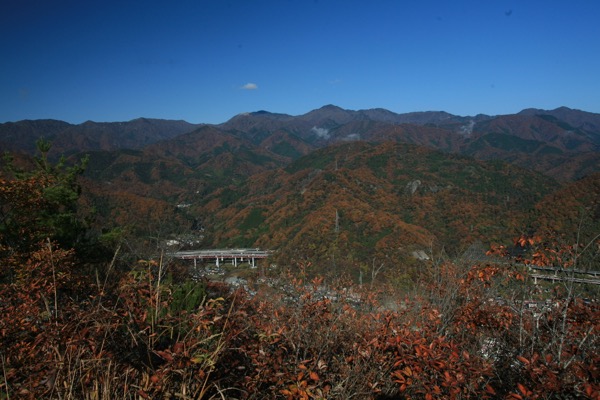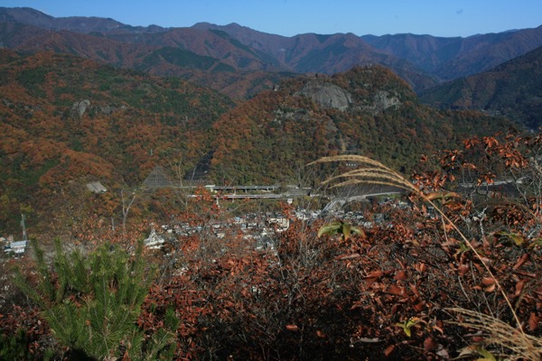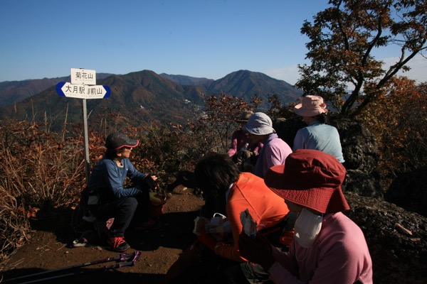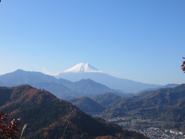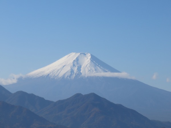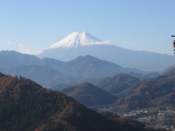 山頂から右手に目を向けると右側の山は扇山。左側にあるのは百蔵山。扇山はJR中央本線鳥沢駅、百蔵山は猿橋駅からいずれも直接登れますが、最近、私たちは大月からタクシーで一気に百蔵山の中腹まで上ってしまって、扇山まで行って1日分と考えています。