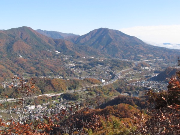 登り始めるとすぐにこの風景。NEC山梨(山梨日本電気株式会社)の白い工場が見えています。光通信用のデバイスや光海底中継装置を担当しているとか。その足元で中央自動車道の富士吉田線が画面左に分かれています。富士急行の線路も左手に伸びていますが、JR中央線と中央自動車道の本線(西宮線)は正面にそびえている滝子山と左手に隠れている高川山の間を抜けていきます。