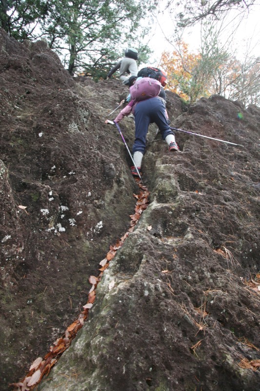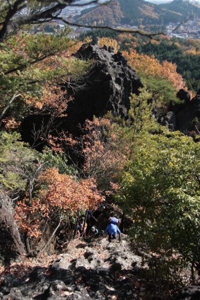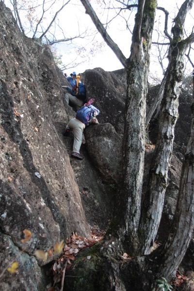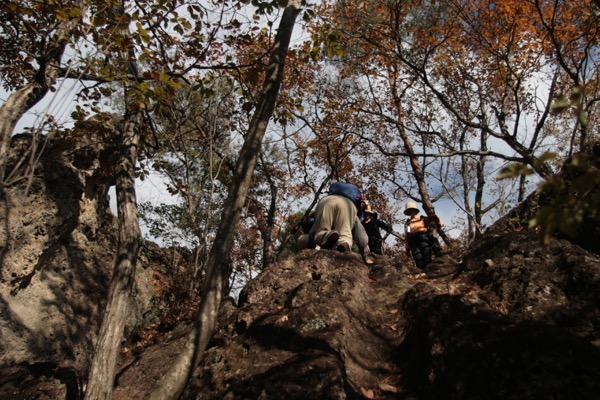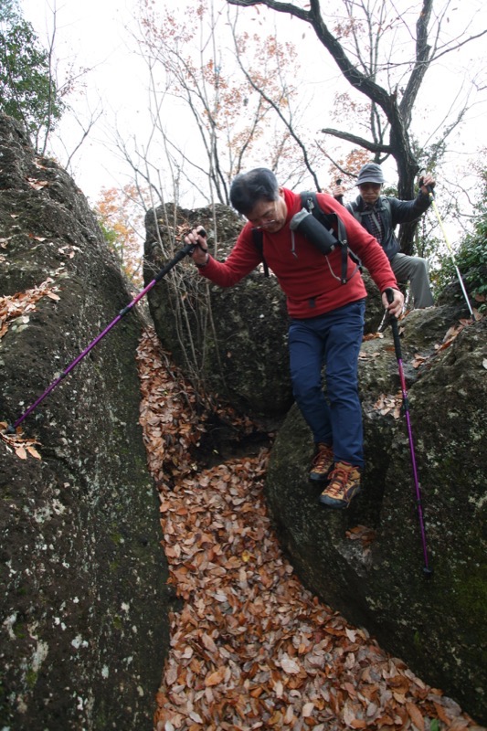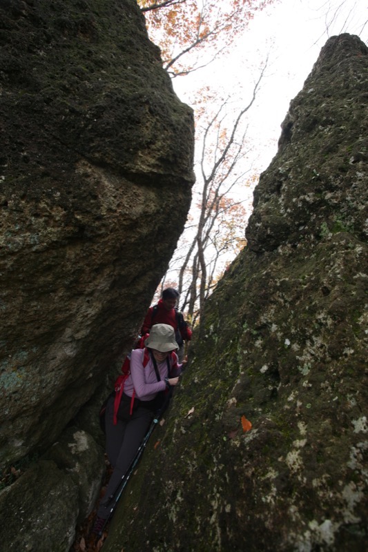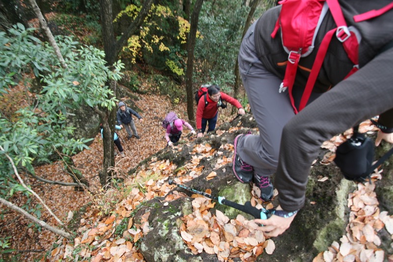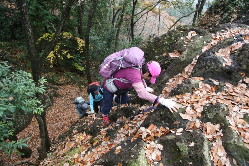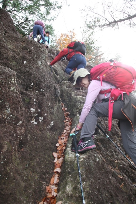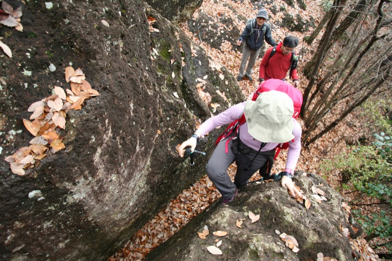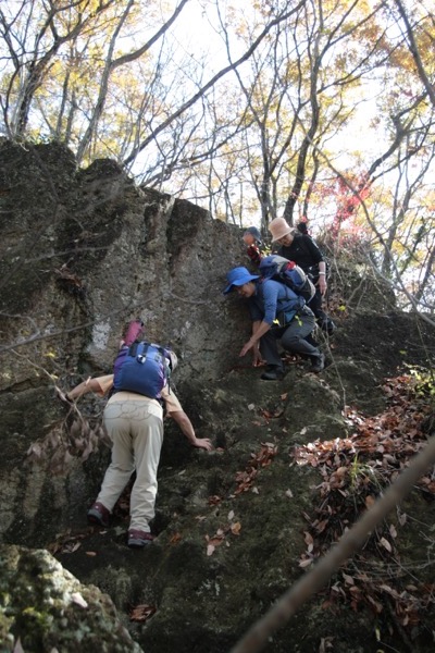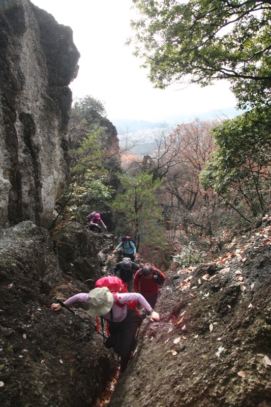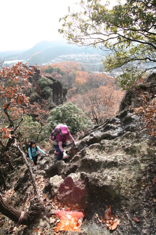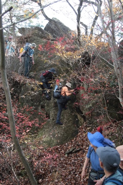 行きの電車の中では 雨が 電車を濡らし 計画が 危ぶまれたが 予定通り 決行。歩き始めると 青い空も見え始めた。私の友人二人の大事なデビュー戦。何とか 雨にならないで無事に終わって欲しい。でも 少し前までは かなりの雨が降り 岩山は 濡れていて 苔の生えている所もあり 難易度かなりアップ。最初の岩を登った所からの一枚。紅葉は 殆んど終わってます。ここで もう すでに お昼を過ぎてます。