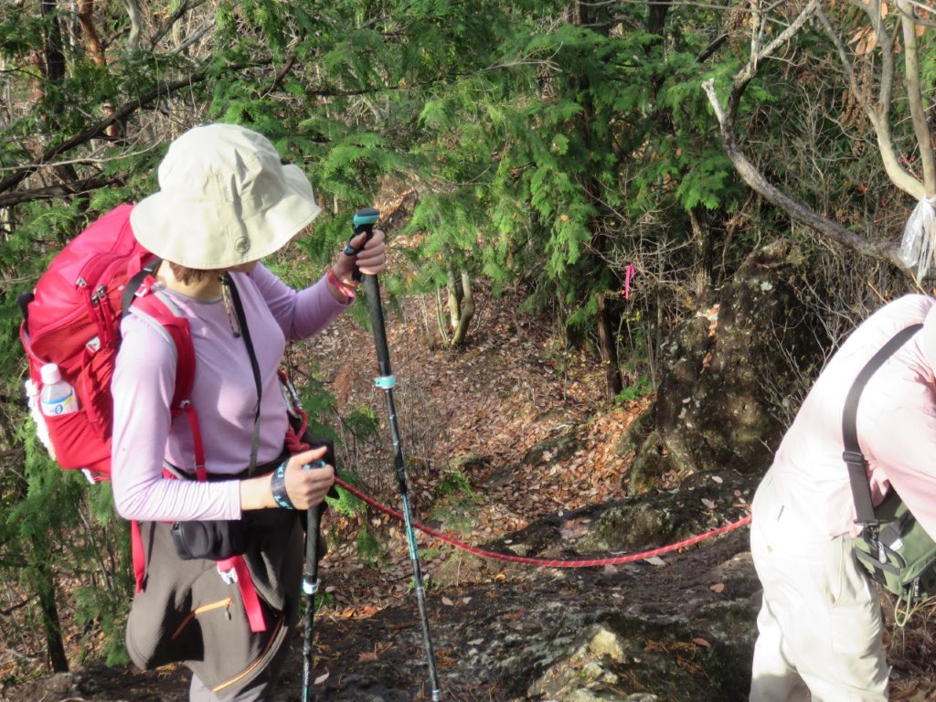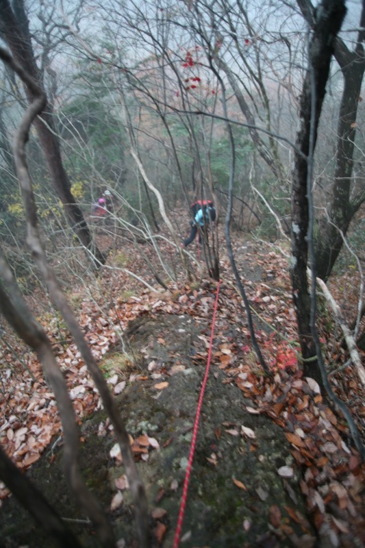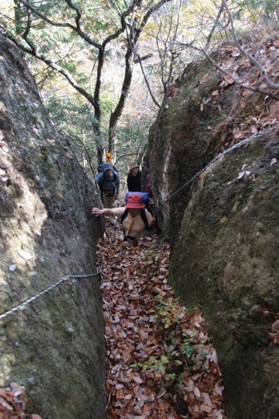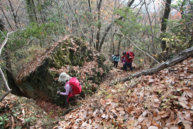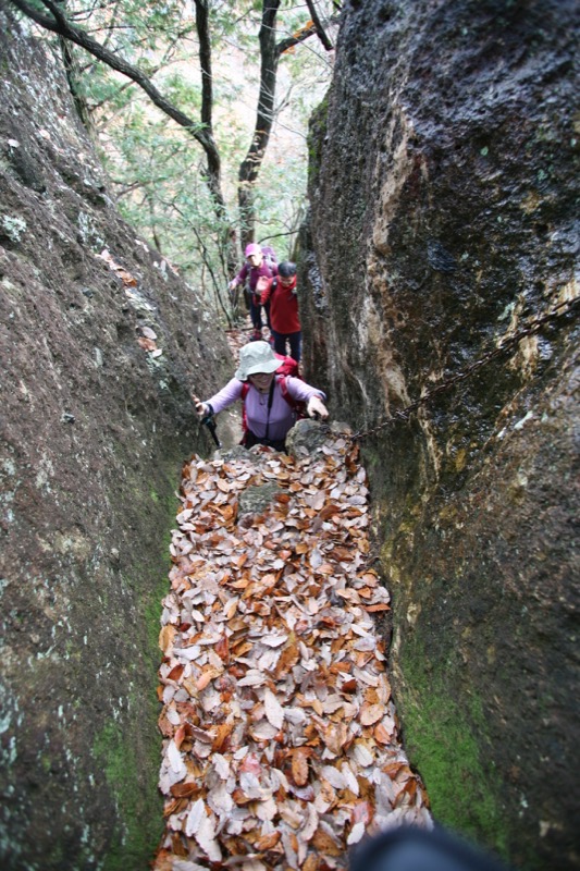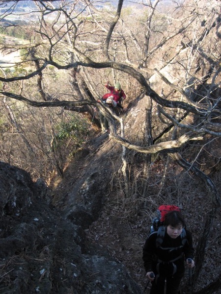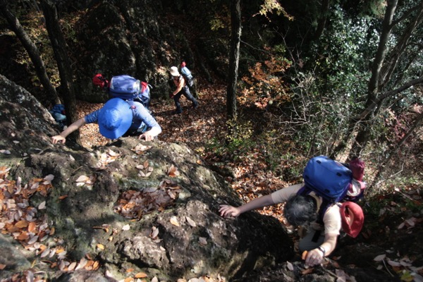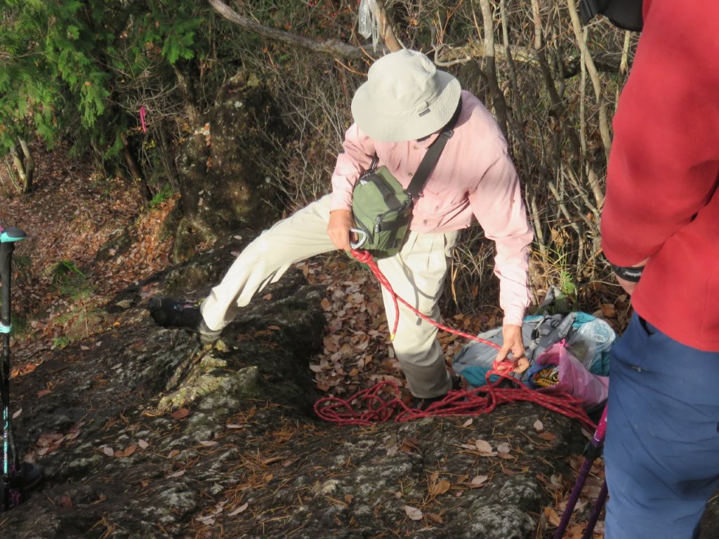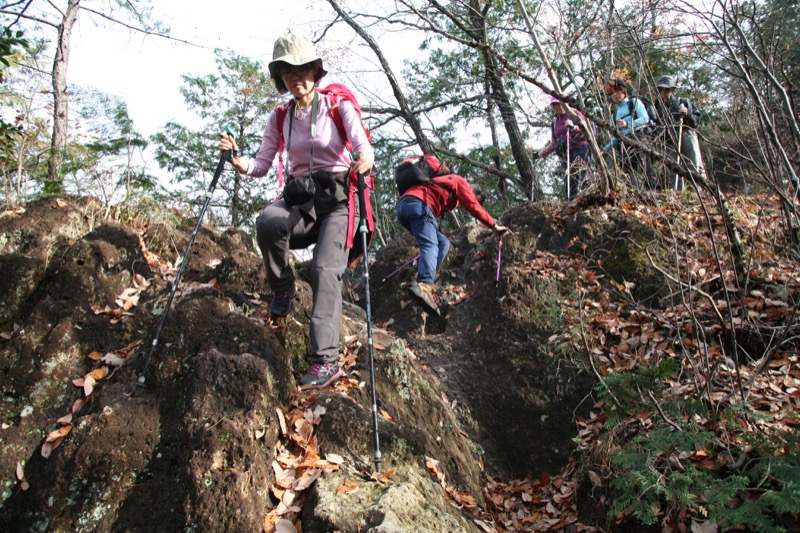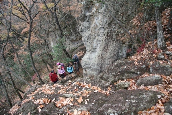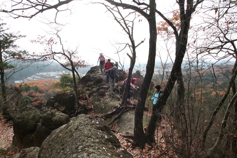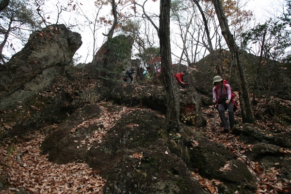 行きの電車の中では 雨が 電車を濡らし 計画が 危ぶまれたが 予定通り 決行。歩き始めると 青い空も見え始めた。私の友人二人の大事なデビュー戦。何とか 雨にならないで無事に終わって欲しい。でも 少し前までは かなりの雨が降り 岩山は 濡れていて 苔の生えている所もあり 難易度かなりアップ。最初の岩を登った所からの一枚。紅葉は 殆んど終わってます。ここで もう すでに お昼を過ぎてます。