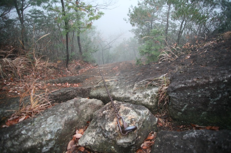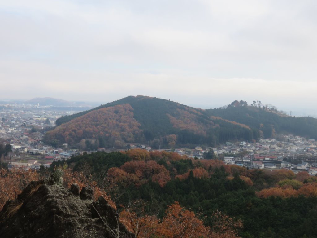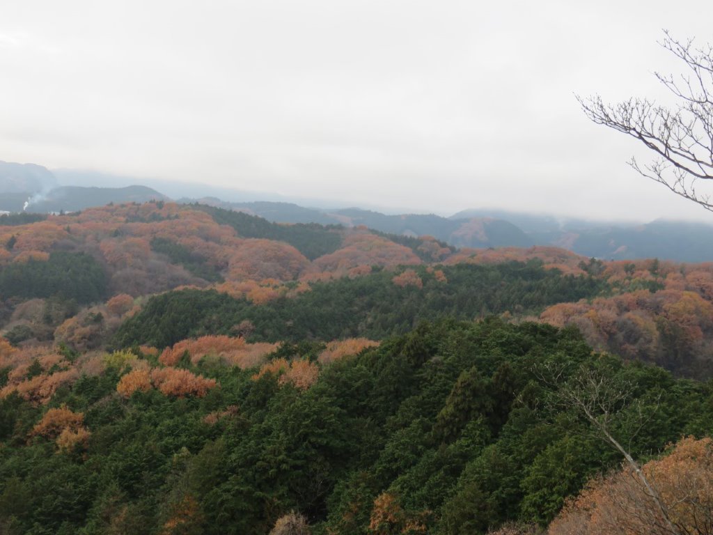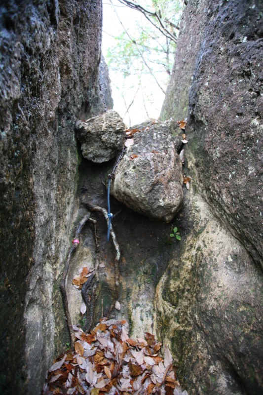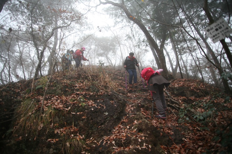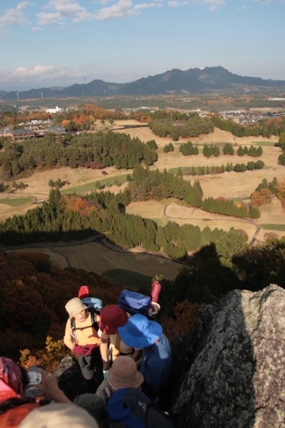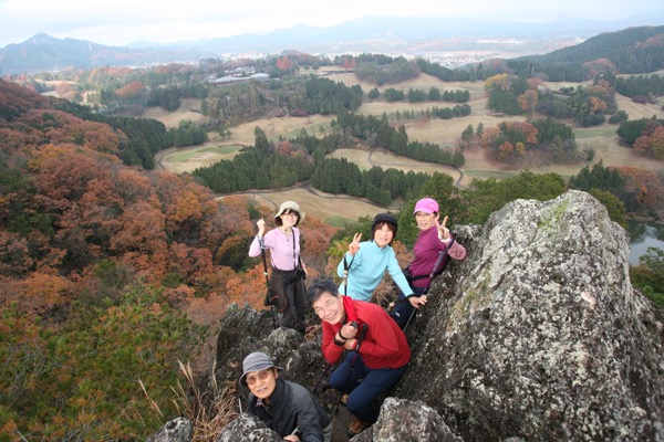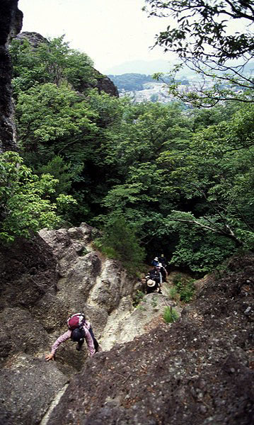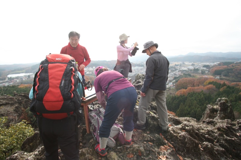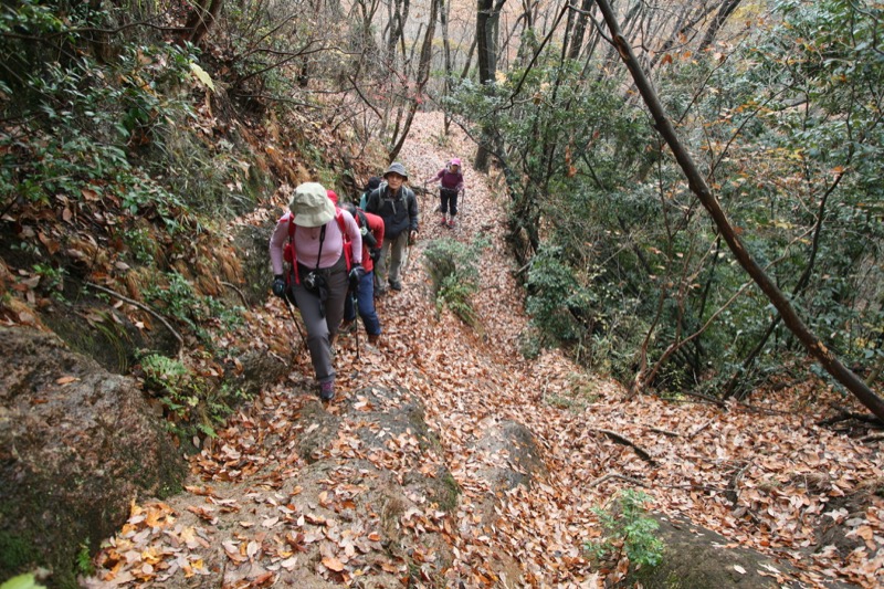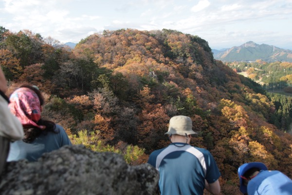 行きの電車の中では 雨が 電車を濡らし 計画が 危ぶまれたが 予定通り 決行。歩き始めると 青い空も見え始めた。私の友人二人の大事なデビュー戦。何とか 雨にならないで無事に終わって欲しい。でも 少し前までは かなりの雨が降り 岩山は 濡れていて 苔の生えている所もあり 難易度かなりアップ。最初の岩を登った所からの一枚。紅葉は 殆んど終わってます。ここで もう すでに お昼を過ぎてます。