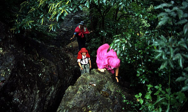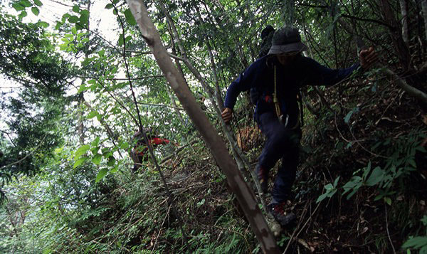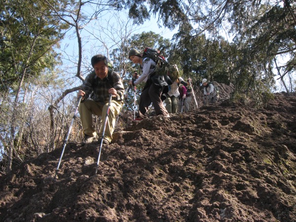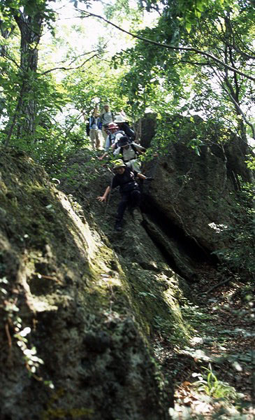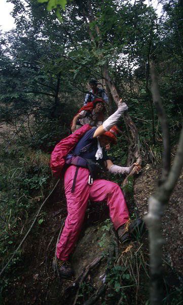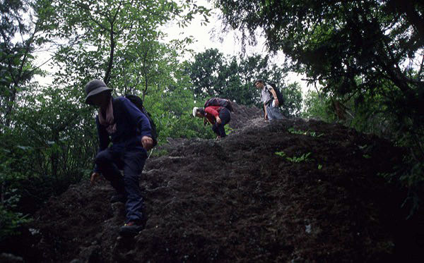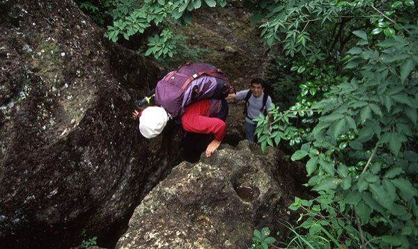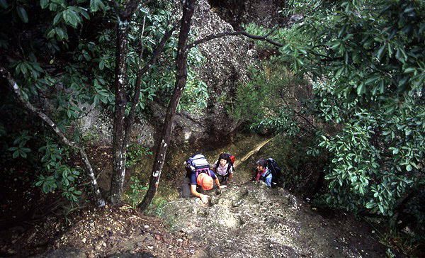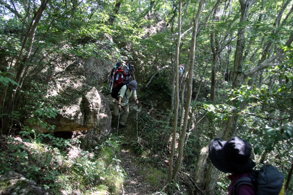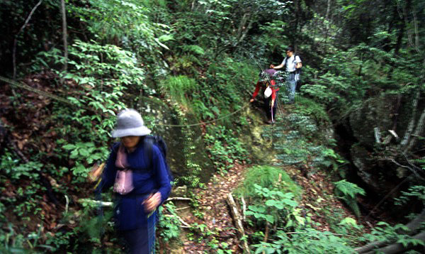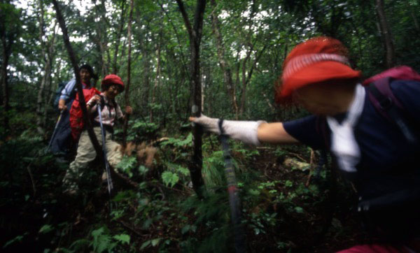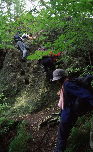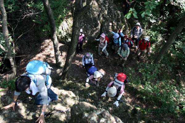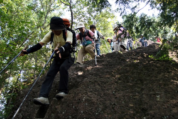 ストック嫌いのリーダーなら「岩場ではストックは危険」ということでしまわせるところでしょうが、ハンドホールドが必要な場合でも、私はストックはベルトに手首を通したまま持ち続けてもらいます。その邪魔なストックをていねいにさばく余裕がある限りは安全だからです。邪魔なストックによって危険な兆候が見えたら、そこで初めて岩の危険に対する対策をとろうと考えています。もし事故が起きるなら、それは予測できる前に突如起こってしまうからです。
