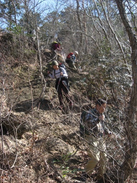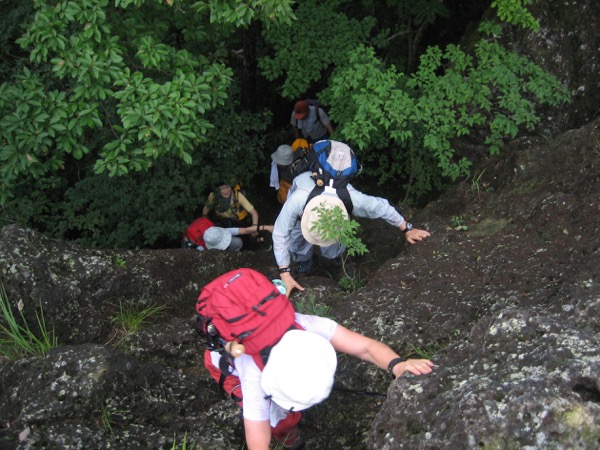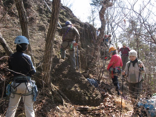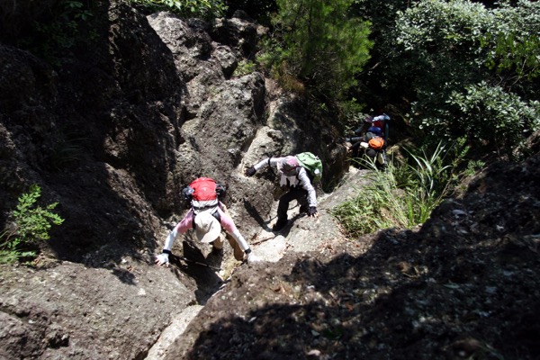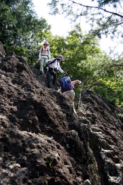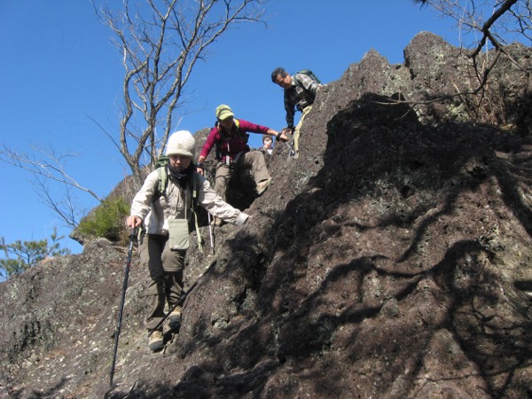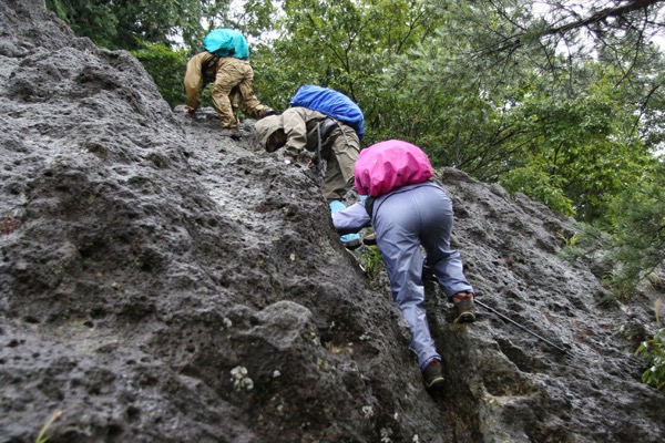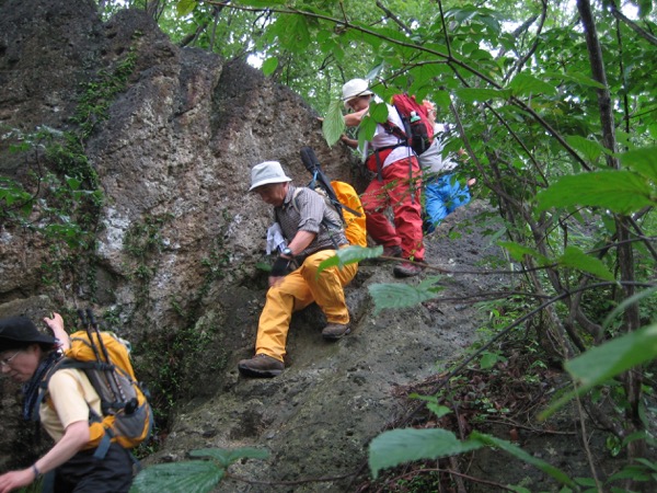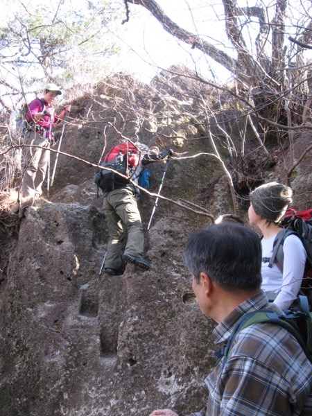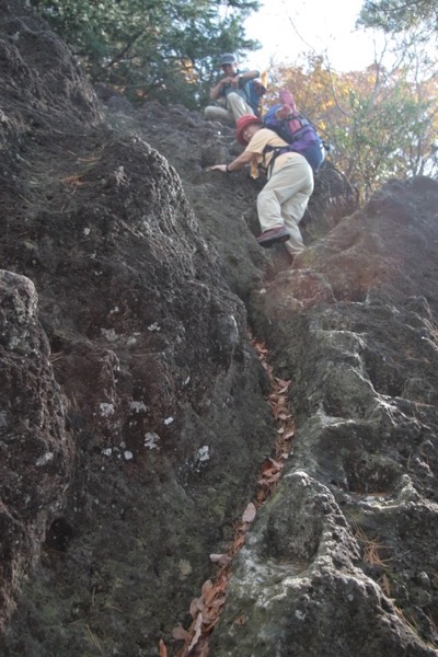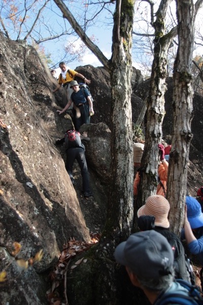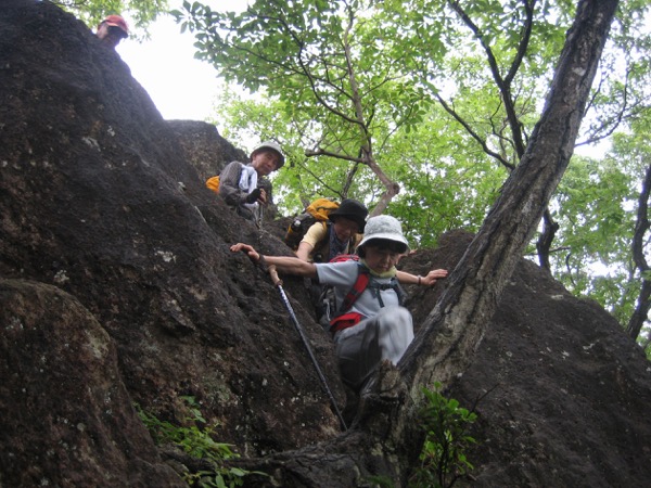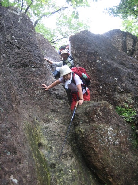 ここを登りきったところが古いガイドブック『栃木の山120』によれば「C峰」。この岩場は大きな危険とは思いませんが、どんな登り方をするか、きちんと見ることができる場所です。合わせて「三点支持」を徹底してもらいます。