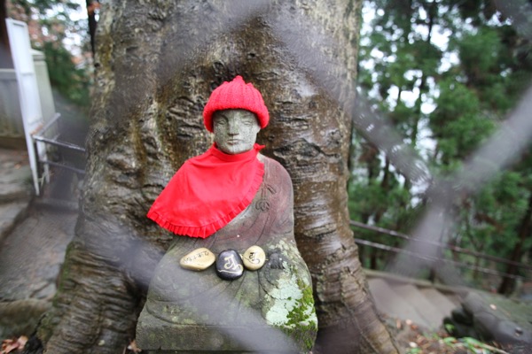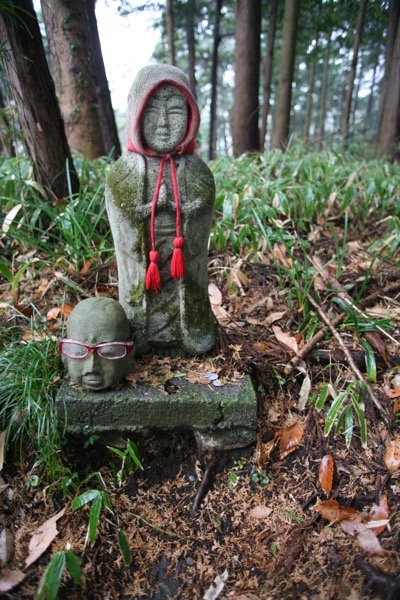お地蔵さんが基本的に赤いよだれかけや赤い頭巾をまとっているのは、赤い色に、たとえば魔除けの効能を感じたり「赤ちゃん」というイメージと重なったりするからのようですが、なんですか、この赤い眼鏡フレームは。