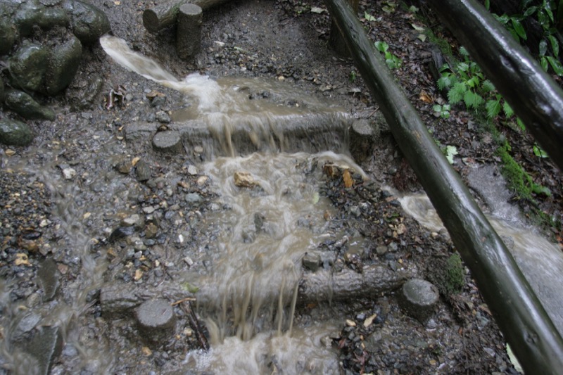 濡れた舗装路が、なんとなくコケっぽく、かかとに重心がいくと派手に転ぶ危険があります。