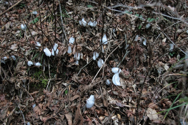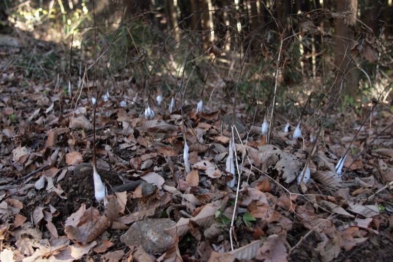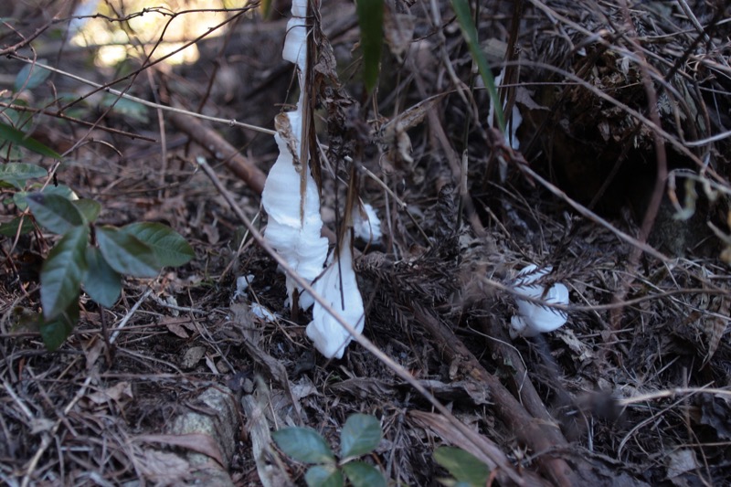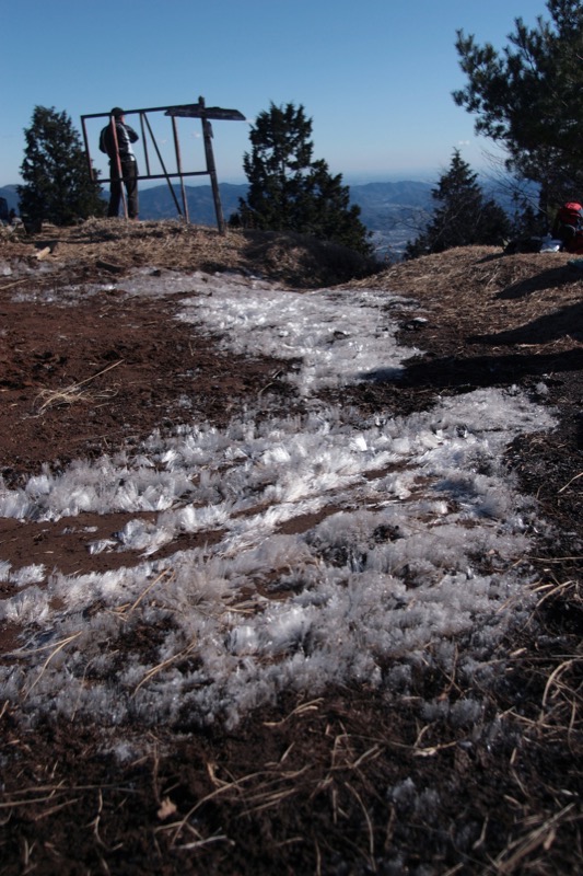 *以前ならダイヤモンド富士がだめでもシモバシラは見られるかも? という期待をしてのことですが、今年は暖かくて始めっから期待感なし。シモバシラは想像どおりナッシング、茶店は城山も紅葉台も完全閉店、山頂の茶店も半営業状態で、できればお客に来てほしくない状態でした。晴れていれば山頂は人でいっぱいになるというのに。そこでさっさと下ることにしました。