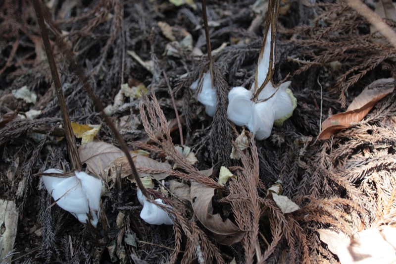 高尾山で初冬に氷の花を作る植物:シモバシラ、カメバヒキオコシ、カシワバハグマ、アズマヤマアザミ