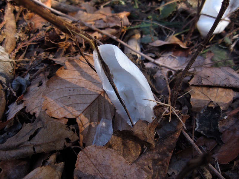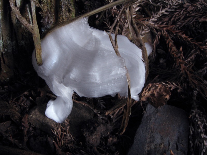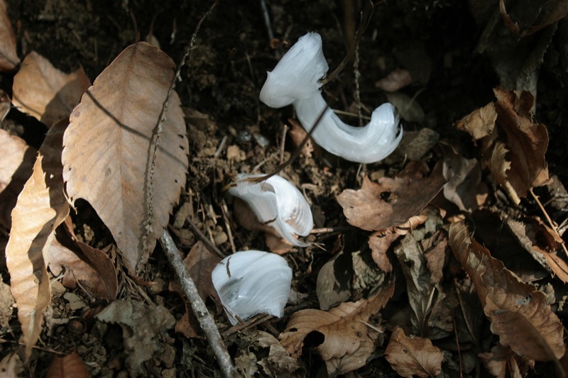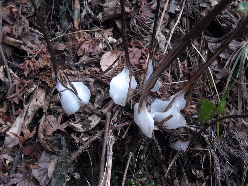 子供の頃、霜柱の細い氷が集まって小石を持ち上げている様に驚いた記憶は鮮明です。シソ科の多年草にシモバシラという植物があります。花も目立たないありきたりの草です。しかし、それが初冬に大変身をするのです。