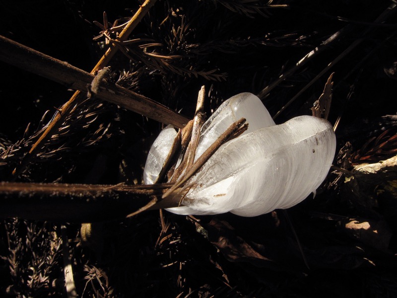 よく冷え込んだ朝、枯れたこの草の根元を見ると、茎から鰭状に氷が張り出し、まさしく、霜柱となって氷の彫刻を作っています。これは茎の維管束の中の水が凍って茎の外へと伸びだしたもので、持ち上げているのは小石ではなく、茎の表皮です。それがこの植物の名の由来です。一度これが出来ると茎の構造は壊れるので一年にたった一度だけ、シモバシラが咲かせる冬の花というわけです。それも、見事なものが出来るには、初めての寒波で急激に冷え込んだときに限ります。
