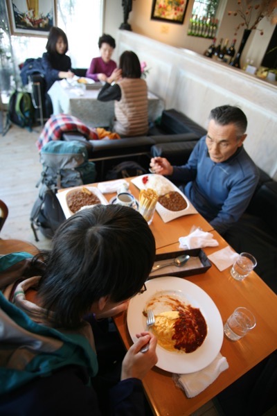 この季節ゆえ温かい飲み物も用意してありますが、風などが吹いていようものなら長居は辛くなります。まずはゆっくりと食事して、残り時間を計りながら歩こうというプラン。みなさん山歩きを始めた頃に一度はたどっているルートです。